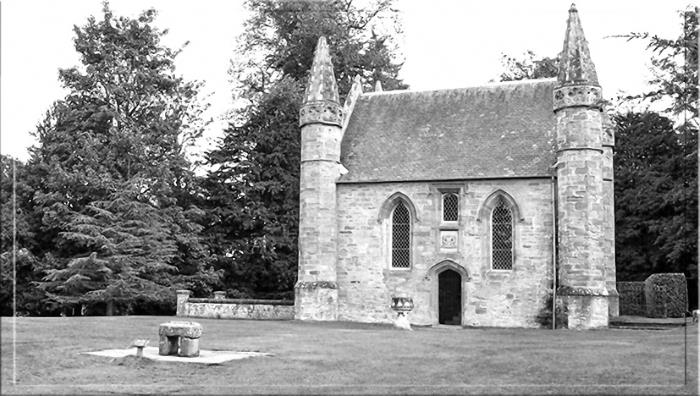 Повторим, что Скунский Камень, или Камень Судьбы, Коронационный Камень – это священная реликвия Шотландии, представляющая собой кусок древнего песчаника массой 152 кг и размером 66 × 42,5 × 26,7 см. В цитате выше указаны слегка иные размеры. «С ОДНОЙ СТОРОНЫ НА КАМНЕ ВЫГРАВИРОВАН КРЕСТ, с другой стороны приделаны два кольца, предназначенные для перемещения реликвии». См. Википедию, статья «Скунский Камень». Якобы до конца XIII века Камень хранился в Скунском аббатстве. Сегодня на территории Скунского аббатства в Шотландии выставлена копия священного Камня, рис. 20. На рис. 21 показан современный вид Скунской часовни с копией Камня Судьбы на переднем плане.