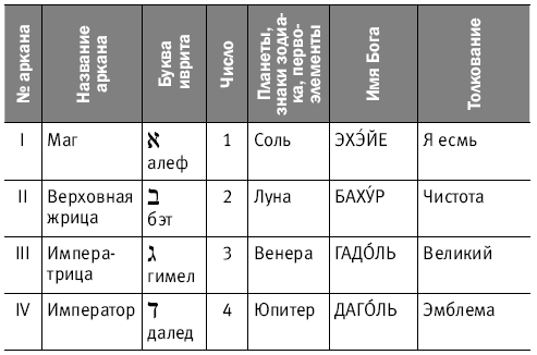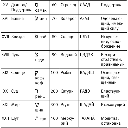 Каждому из Старших арканов таро также соответствует определенная буква алфавита иврита, число и имя Бога.