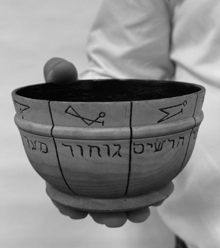 ▶ Чаша. Предпочтительнее, если она будет деревянной. В начале работы лучше не расписывать ее и не покрывать лаком. Назначение чаши – давать растяжку по времени и позволять двигаться в нем. Для этого у нее должна быть своя память. Чем чаще мы носим чашу с собой, тем больше памяти и островков для смещения во времени она нарабатывает. Внутренняя часть чаши должна быть черного цвета, чтобы видеть духов. Когда мы держим чашу, большой палец располагается поверх ее верхней кромки. Во время ритуала в чаше находится вода. Воду можно вращать против часовой стрелки, создавая завихрения и переписывая прошлое и мир. В воду можно добавлять различные масла, подбирая их под конкретную задачу. Однако нужно помнить, что, хотя масло усиливает работу, оно также делает процесс менее контролируемым. После ритуала вода из чаши выливается в течение часа.