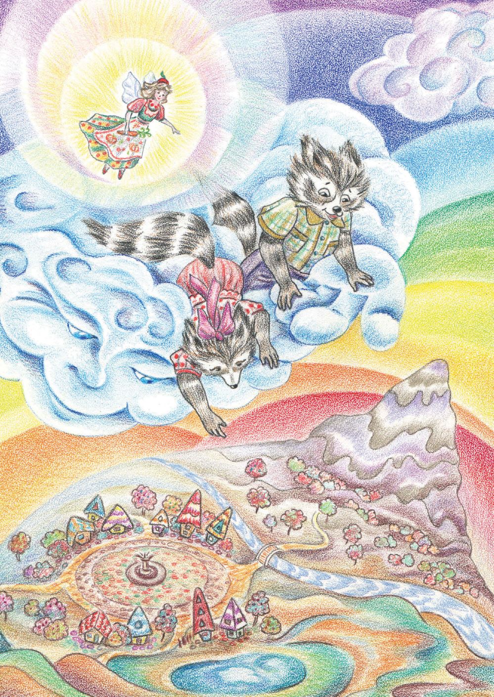 И они полетели в Волшебную страну Сластию. Ветер свистел у енотиков в ушках. Затем облако замедлило ход и стало снижаться.