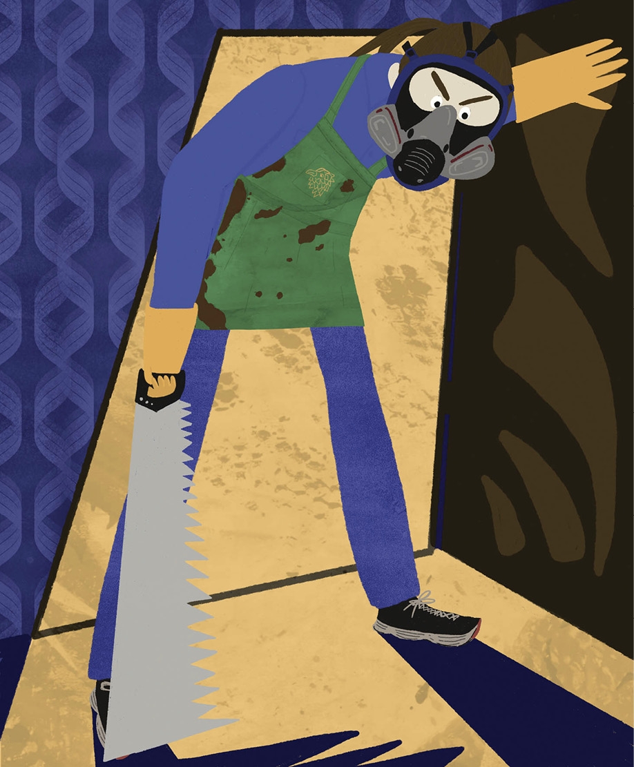 Дверь в комнату была распахнута. В проёме стоял незнакомец – в респираторе и в фартуке, покрытом бурыми пятнами. В его руке застыла здоровенная пила.