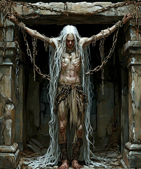 […] весь обмотанный толстыми и тонкими цепями, фактически распятый в них, передо мной находился истощённый до невозможности человек… Или не человек?
