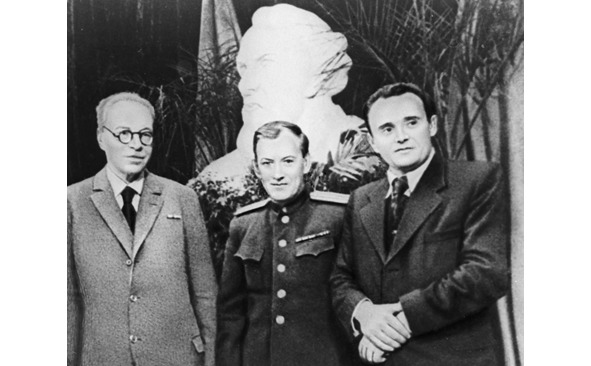 Б. Н. Воробьев (биограф Циолковского), М. К. Тихонравов и С. П. Королев на праздновании 90-летия со дня рождения К. Э. Циолковского (РГАНТД, Ф. 211 оп. Д.501/опубликовано в интернете)