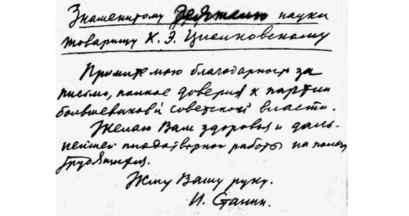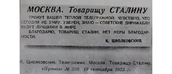 17 сентября 1935 года (в последний прижизненный день рожденья) Циолковскому в больницу была доставлена поздравительная телеграмма от И. Сталина.