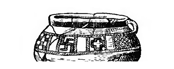 Это хорошо иллюстрируют материалы, приведенные в работе А. Л. Монгайта, где показаны различные сосуды пшеворской культуры, декорированные меандрами и сложнопрорисованными свастиками, и в статье Э. А. Сымоновича, где также даны образцы меандрово-свастического декора (табл. 11). Э. А. Сымонович в своей работе отмечает, что свастика, встречающаяся на сосудах эпохи бронзы, «широко распространена в чисто славянских узорах эпохи Киевской Руси, обозначая знак солнца». И, наконец, если мы обратимся к скифскому периоду на территории Среднего Приднепровья, предшествовавшему времени появления пшеворской и зарубинецкой культур, то и здесь встретим ту же самую картину. На сосудах из днепровской лесостепи одним из распространенных орнаментально-знаковых мотивов была свастика, как простой формы, так и очень сложного рисунка, с множеством крючков-отростков на концах. Причем исключительно интересным представляется тот факт, что на одном из сосудов 6 века до н.э. из раскопок у села Аксютинцы, рядом с равноконечным крестом и свастиками различных очертаний помещен, значительно превышающий их размерами крест, который станет на Руси «православным» крестом (табл. 11).