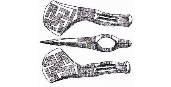 Исключительный интерес представляют также меандровые и свастические мотивы на бронзовых топорах кобанского типа из того же Тлийского могильника. Сложнопрорисованные свастики, помещенные на этих топорах 12—9 века до н.э. имеют аналоги в орнаментике поздняковских сосудов, т.е. культуры близкородственной и одновременной андроновской.