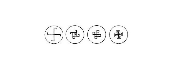 Такая форма свастики, с концами, изгибающимися в виде меандра, была придана также и металлической пряжке 1220—1260 г., найденной на Тихвинском раскопе Новгорода (табл. 10). Надо отметить, что эта необычная и достаточно сложная форма доходит без изменений до 1910-х., когда вологодская крестьянка Ульяна Теребова, выполняя браную проставку для свадебного полотенца своей дочери (табл. 10), орнаментировала её именно такими меандровыми крестами. Традиционными для андроновской керамики 17—9 века до н.э., средневекового русского лицевого шитья, вологодских вышивок, кружева, ткачества конца 19-начала 20 века «гуськами» украшены костяные гребни 9—10 века, найденные в курганах Суздальского Ополья и в нижних слоях Старой Ладоги. Знаком свастики отмечено глиняное пряслице из поселения 7—8 века н. э. на реке Тясмин, принадлежащего древнему славянскому племени уличей (табл. 9).