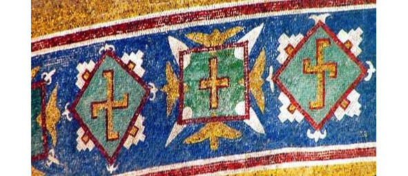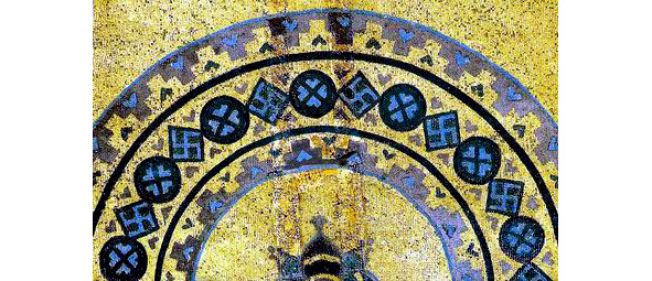 Свастика, как элемент декора, встречается в кирпичной кладке и мозаиках первых христианских соборов Киевской Руси. Это главный мотив орнаментального пояса композиции «Евхаристия» мозаики абсиды Софийского собора в Киеве (11 век).
