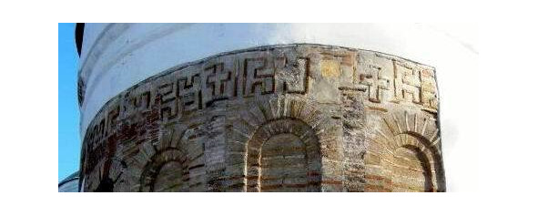 Исключительный интерес представляет орнаментальная выкладка, которой оформлена лестничная башня Спасского собора в Чернигове, одного из древнейших сооружений средневековой Руси, ровесника Киевского Софийского собора (начало 11 века). Опубликовавший эти, открытые после снятия поздней штукатурки декоративные выкладки, Н. В. Холостенко считает, что подобные орнаменты имели «специальное, символическое значение». Он отмечает, что особо богатое оформление лестничной башни, выделяющее её из других частей собора, связано с тем, что она была местом «ритуального входа князя и его приближенных на хоры». (табл. 10). Во втором ярусе башни помещен широкий орнаментальный пояс, составленный чередующимися равноконечными крестами и сложно прорисованными свастиками.
