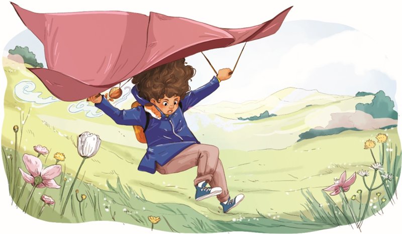 От порыва ветра на небольшой улочке красный плащ надулся, словно ткань воздушного змея. Через мгновение Розу подняло в воздух. Девочка крепко вцепилась в ручки порхалки, она почувствовала толчок тёплого воздуха от розы ветров позади. Поток был такой силы, что Роза смогла на него присесть, словно на сиденье, и теперь летела, будто бы на параплане.