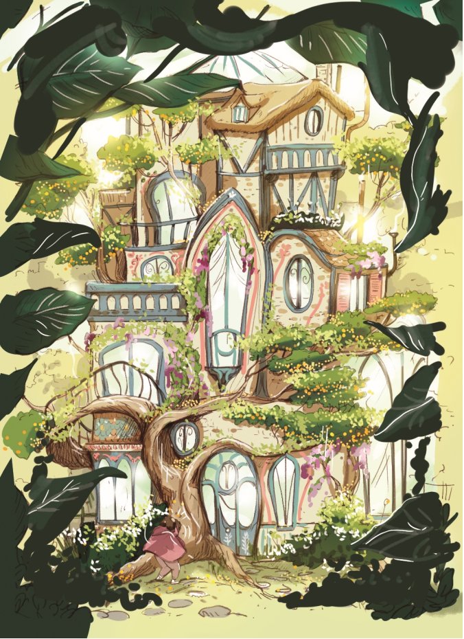 Прошагав с полчаса вдоль тенистой тропинки, Роза и Тапенад добрались до уединённого дома, утопающего в зелени. В воздухе разливался сладкий сливовый аромат. Запах исходил от огромного дерева, увешанного плодами. Его ствол поднимался из домика причудливой формы, над которым нависали массивные ветви. На каменных стенах щедро цвела зелень, и её побеги разбегались по многочисленным крышам.