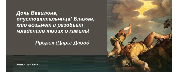 Вавилон – значит мир греховный, грехом пленяющий и порабощающий. Дщерь Вавилона есть плоть, воспитанная суетою и прелестью миpa. Младенцы ее суть нечистые помыслы и греховные желания. Камень есть Христос. Святитель Филарет Московский