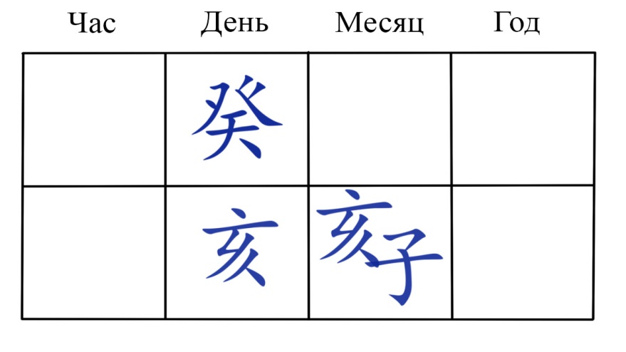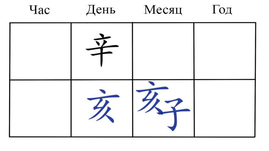 День 辛亥, 辛 использует 丙 как ПЧ, 癸亥 день, 癸 использует 戊 как ПЧ. Для обоих желательно чтобы в столпах было много 亥, сталкиваясь с 巳 внутри 丙, 戊, в таком случае 辛, 癸 получают ПЧ. ЗВ в карте имеют 申 или 酉, 丑, только получая единственное (одно) слияние – в таком случае прекрасные и очаровательные.
