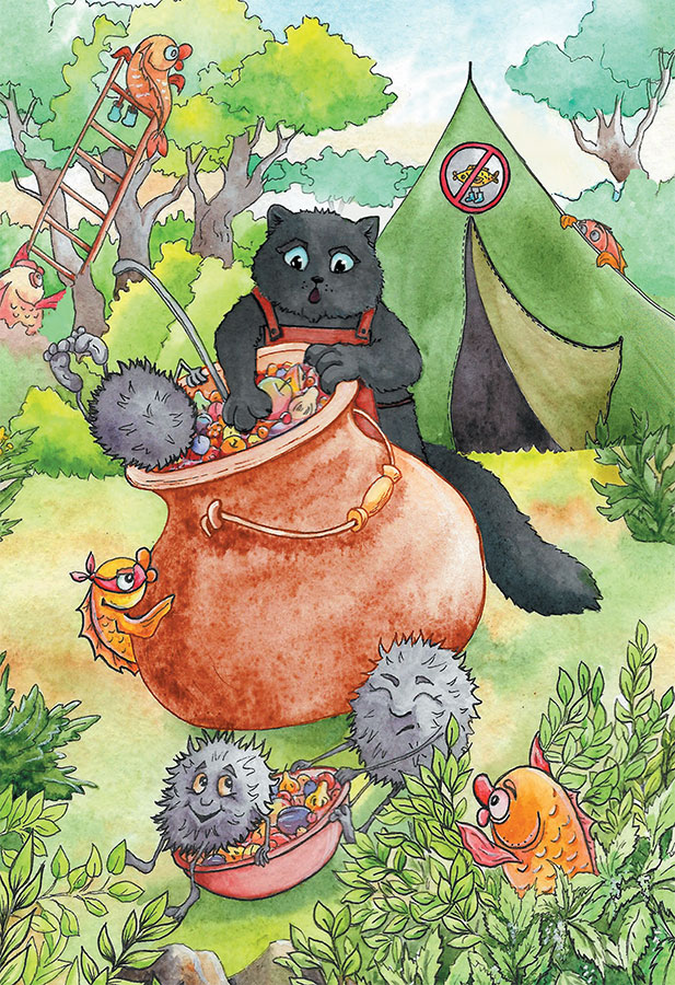 Вот рыбы надевают сапожки и хулиганят – воруют ягоды, варенье, а потом и кота.