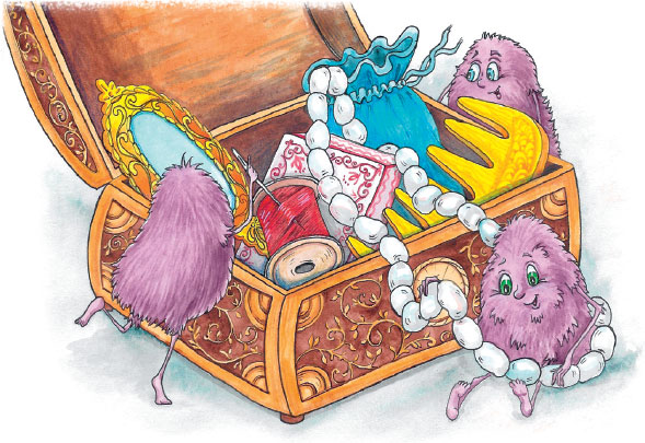 Вовка развязал тесьму и осторожно высыпал содержимое на скатерть. Из мешочка выпали жемчужное ожерелье, браслет, серьги и кольцо. Домовушки похватали украшения и стали примерять – кто на голову, кто на талию.