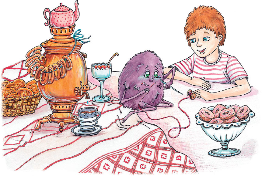Вовка тихонечко свесил голову с печки и выглянул из-под кружевной занавески. Бабушка в кухне была одна. Почти. На табуретке сидел кот, а на столе и вокруг суетились какие-то чёрные пушистые кругляши размером с котёнка. У них были тоненькие, похожие на лапки, ручки и ножки. Одни сыпали в миску муку, другие сахар, кто-то размешивал тесто, стуча ложкой, кто-то подметал под столом мусор.