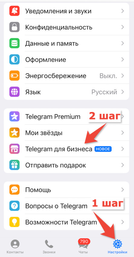 Вот как это выглядит внутри в настройках. Заходишь в «Настройки», выбираешь «Telegram для бизнеса». Появляется возможность настроить «Быстрые ответы» и «Автоприветствие».