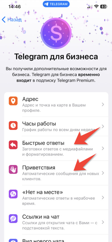 Также платный тариф дает дополнительные символы для описания профиля и канала, возможность сформировать быстрые ответы и автоприветствие. На данный момент очень мало людей используют эти фишки, что дает тебе преимущество – ты будешь выделяться на фоне конкурентов. Эти две функции находятся в новом разделе «Telegram для бизнеса» и доступны только тем, у кого подключен тариф премиум.