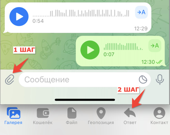 Чтобы появилось меню быстрых ответов, нажми на иконку «Скрепка» рядом с полем для ввода сообщения. Затем в предложенном меню выбери иконку «Стрелка» – и вот они, ваши быстрые ответы! Смотри фото.
