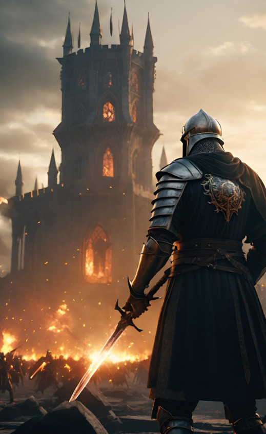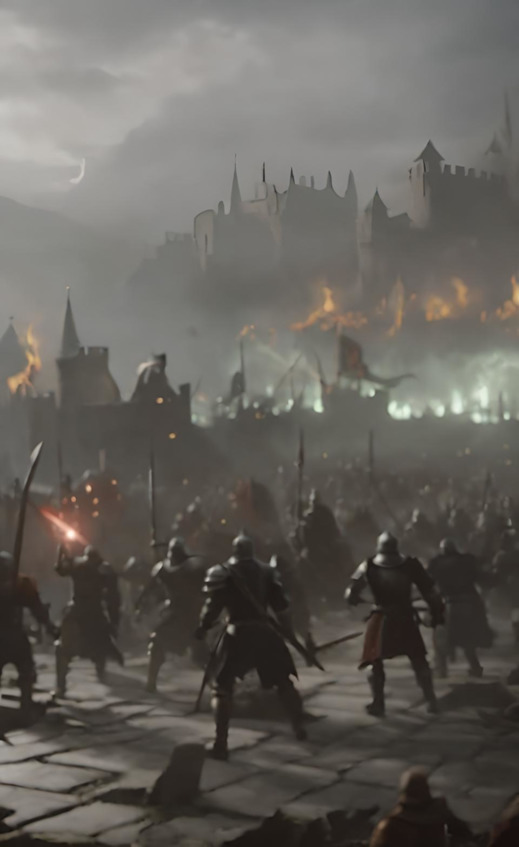 And in this cacophony of battle, where the cries of the wounded mingled with the clash of metal, the roar of the dragon, the echoes of battles in the streets, and the thunder of blows against the sealed castle gates, where the air reeked of gunpowder, blood, and magic, a figure appeared against the backdrop of the raging battle, at the center of the last bastion of resistance, on the wall of the Castle of Darkness. Tall, clad in black armor, with a helmet crowned with horns, and a face contorted with fury and scorn. It was the Dark Lord, Grimnir, the last of the mighty rulers of the dark realm. In his hand, he held an ancient staff, from which streamed dark, dense energy.