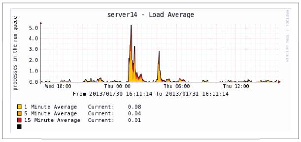 На рис. 1.2 приведен пример загрузки сервера. С небольшими вариациями на протяжении дня очередь выполнения составляет 0,5 или меньше. В час ночи загрузка начинает расти и за 30 минут увеличивается до пяти и выше, в десять раз по сравнению с «нормой». Ситуация нестандартная. Что происходит? Возможно, требуется вмешательство? Но что нужно сделать?