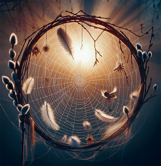 Сила сети также отражается и в легенде о прибытии на Землю первой пары кри, спустившейся из Верхнего Мира в сумке из паучьей сети, сплетенной Великой Ткачихой Сетей, или Паучихой. Образ корзины, сплетенной Паучихой, перекликается с описаниями детских амулетов и в конечном итоге с ловцами снов. Нить Паучихи связывает мир Неба и мир Земли, духовную и физическую реальность.