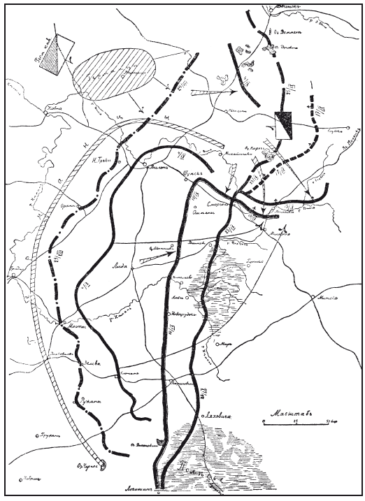 Немцы хорошо знали, что наше снабжение в августе и сентябре было в самом ужасном положении; они видели, что почин действий был всецело в их руках. Стык Западного и Северного фронтов в районе озера западнее Свенцян был занят только слабыми отрядами кавалерии. Главнокомандующим Западным фронтом был недавно назначенный (19 августа) генерал Эверт, стратегические способности которого они также знали… Естественно, что ими был предпринят прорыв в направлении железной дороги Вильна – Двинск, на Свенцяны. Нам поневоле пришлось загнуть вовнутрь обнажившиеся фланги. В образовавшийся коридор немцами была брошена вся масса кавалерии, заранее сосредоточенной у Вилькомира. 1 сентября она захватила ст. Свенцяны, а вскоре сеть ее разъездов, поддержанных конной артиллерией, была уже на железном пути Молодечно – Полоцк. Немцам очень хотелось захватить первый пункт, имевший понятную весьма большую важность для обеих сторон. Но не только захват, а и просто порча молодеченского узла немедленно очень тяжело отразилась бы на всем нашем Западном фронте. Мы, однако, успели занять Молодечно и, как бы игнорируя окружение этого узла с трех сторон и бомбардировку его немецкой артиллерией, задерживали их наступление и отстаивали занятое.