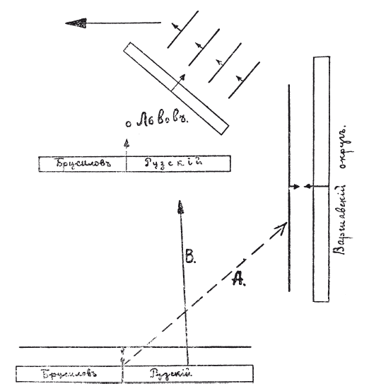 ► Рузский, командуя армией в Галиции на Юго-Западном фронте, проделал штуку, которая очень характерна вообще для наших больших военных: во-первых, забыл об интересах русской армии и очень помнил об интересах генерала Рузского; во-вторых, не исполнил отданного ему приказания, сознательно его нарушив. Положение войск в Галиции перед взятием Львова см. схему.
