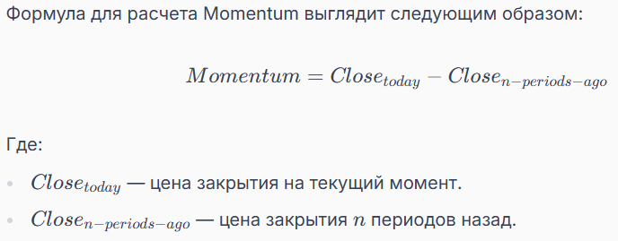 Momentum – это индикатор, который измеряет скорость изменения цены за определенный период. Он помогает определить, насколько сильно цена изменилась по сравнению с предыдущими значениями.