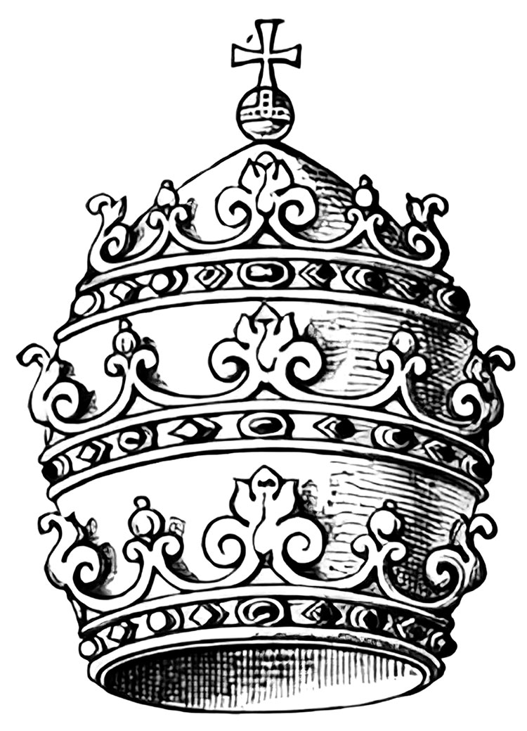 Из всех венценосных особ только на его голову из рук кардинала-протодьякона торжественно опускалась не корона, но тиара, украшенная тремя драгоценными ореолами, каждый из которых символизировал род власти, принадлежащий верховному понтифику.