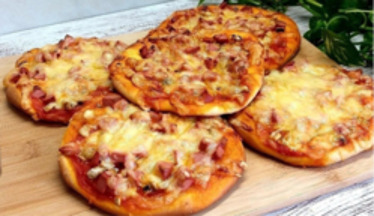 Кружочки складываем на форму для выпечки смазанную растительным маслом. Смазываем майонезом, слегка солим и первым слоем укладываем ветчину. Вторым слоем посыпаем тертым сыром. Третий слой это помидоры и кружочки оливки. Посыпаем остатками сыра.