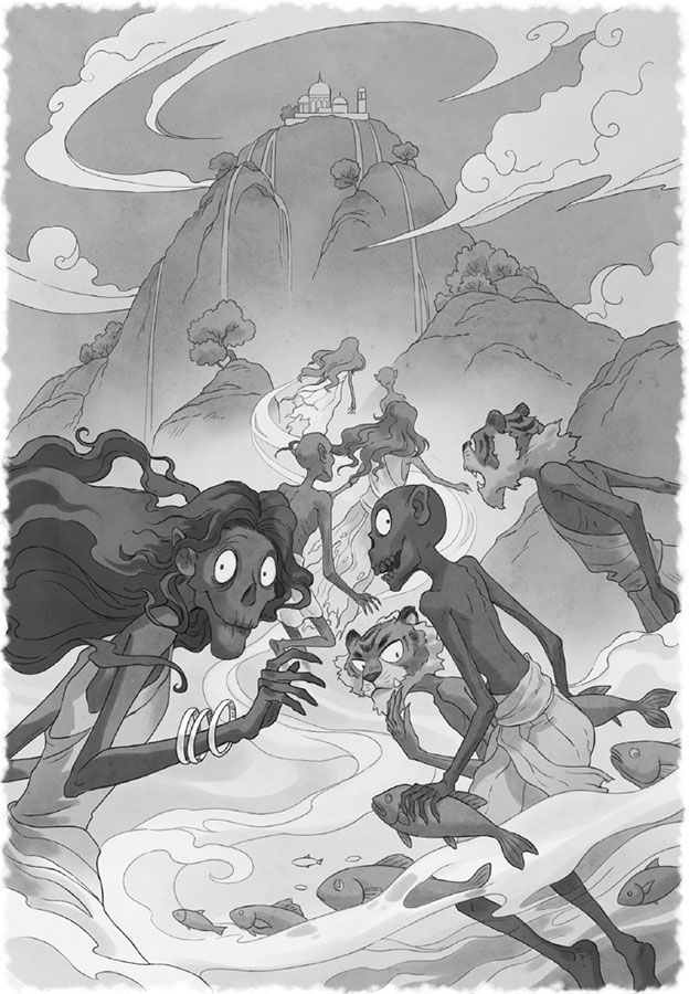 Небесное царство, где жила принцесса Пакхирадж, уже было недалеко, поэтому Раат, Снежок, близнецы и Шипучка, а вместе с ними и вся толпа бхутов отправились на вершину прекрасной Небесной горы, где сверкало на солнце прозрачное озеро, окружённое цветущими деревьями. Спрыгнув со спины Раата и спустив на землю Шипучку, Кинджал наконец увидел всех прилетевших с ними бхутов и невольно попятился. Здесь были шакчунни – призраки замужних женщин. Их кожа давно усохла, и сквозь неё просвечивали черепа; сари истлели, а браслеты позвякивали на костях, которые когда-то были руками. Петни – незамужние женщины – выглядели примерно так же, только без свадебных браслетов. Их сбившиеся в колтуны и поросшие мхом волосы стояли дыбом, а из мёртвых глазниц таращились огромные глаза. Бегхо – призраков людей, съеденных тиграми, – Кинджал узнал сразу, поскольку они, по своему обыкновению, имели облик тигров. Скондокаты носили свои головы в руках, словно шлемы. Ну а мечхо прижимали к себе охапки рыбы, оставляя за собой тухлый запах цветущего моря.