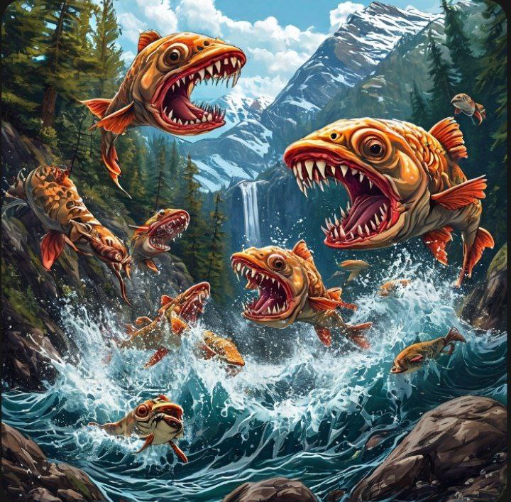 В тот же момент, из реки, по направлению к нему, стали выпрыгивать какие-то огромные зубастые рыбы, клацая своими страшными пастями. Лествичек бросился к берегу. Выскочив из реки, он обернулся и увидел, что рыбы также выпрыгивают из воды, но достать до него уже не могут.