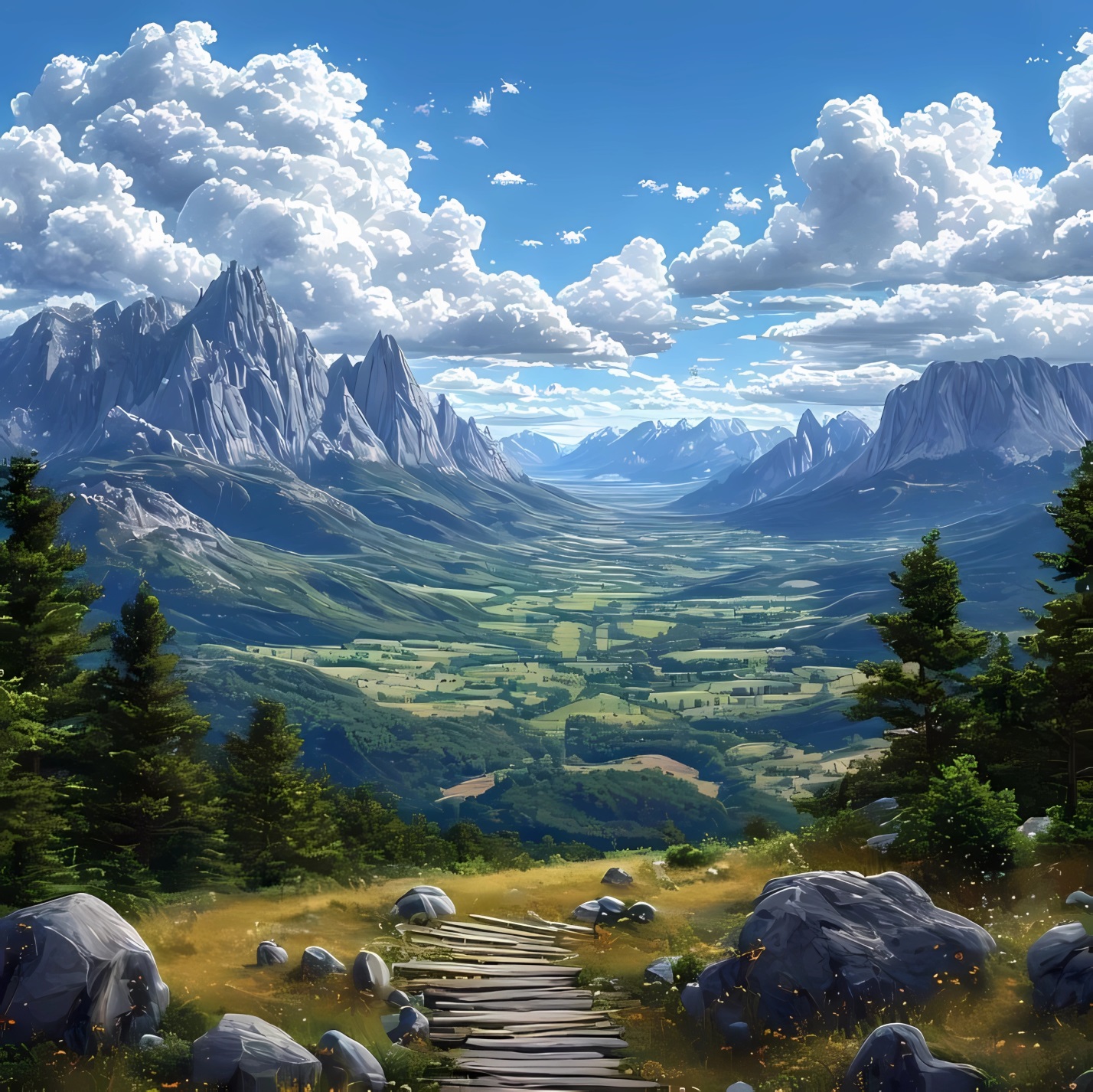Вскоре лествички достигли самой вершины и оказались на широком, просторном плато, откуда открывался захватывающий вид на дальние горизонты. В ясном небе величественно катилась полудневная скатерть облаков, мягко окутывающая горные пики, как пушистое одеяло. Окружающий пейзаж поражал изысканной простотой; вокруг расстилались обширные поля с тёмными островками валунов и тенистых перелесков, напоминающих о древних тайнах.