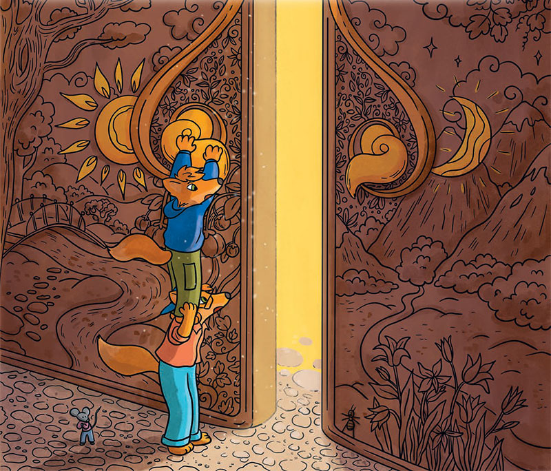 Изо всех сил лисята навалились на резное полотно двери, и, хотя это было непросто, кое-как им удалось ее сдвинуть. Дальше было легче – дверь подалась и пошла на скрипучих старинных петлях. Но тут Шустрик прищемил себе дверью хвост и вскрикнул. «Совсем как мама», – подумал Мудряш, бросаясь помочь брату.