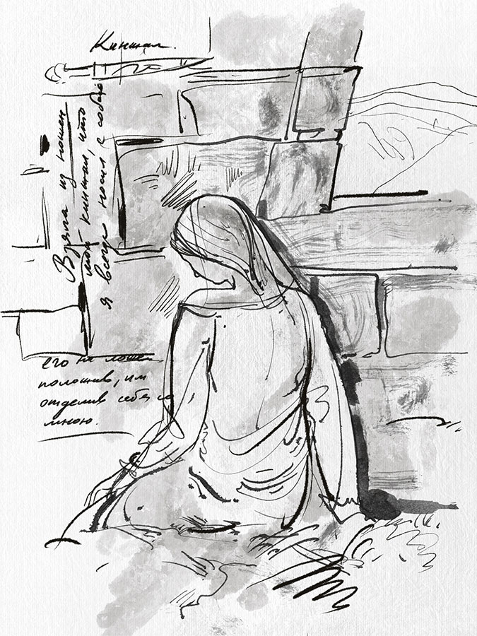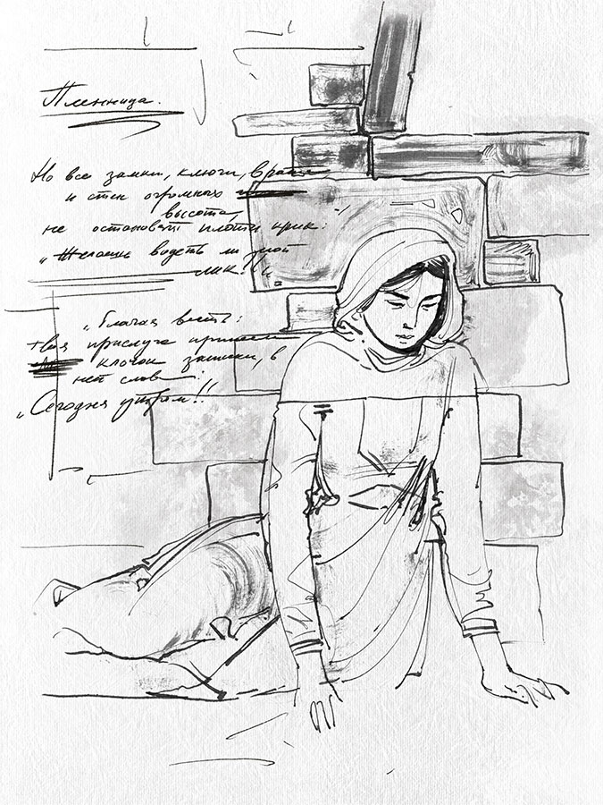 Я не видел,что же с любимой —на моей голове былмешок.Только слышу,с собой где-то рядомстук копытмерным звуком:«цок-цок…»Вот приблизиласьнужная лошадь —я как мог, закричал:«Айджане»!Но не слышноответа любимой:лишь нагайкапрошлась по спине.Тут же взвылот удара нагайки —словно рой осв плоть впился за раз!Слышу, пленницакрикнула: «Саша!»Но в ответ – свистнагайки сейчас…* * *Тропка тянет наск скалам, где круче!Показалось мне —скоро привал.Дальше, видимо,хмурые тучида селенье —то грозный сигнал.Лишь когдадовезли до аула,спали сумерки,кончился путь…Здесь сознаньетоскою накрыло:что же ждёт нас?Так страшно, аж жуть!Лишь заехавв границы аула,нас сгрузилиу старой стены.Бородатый стражвстал на охране,а в глазах – ярость,кровью полны…