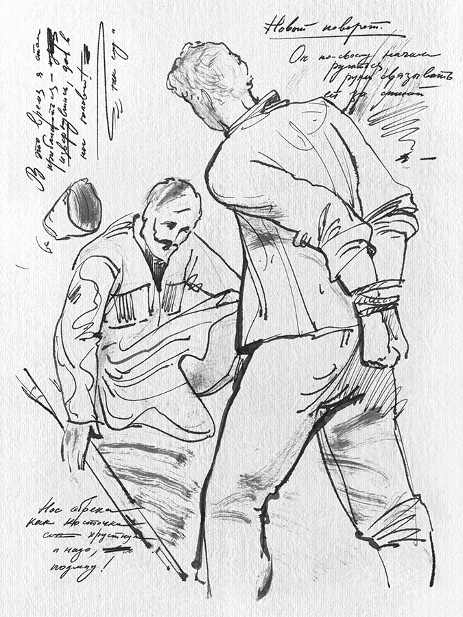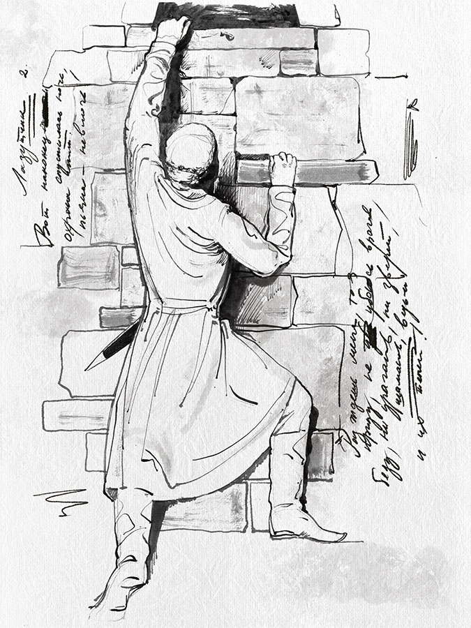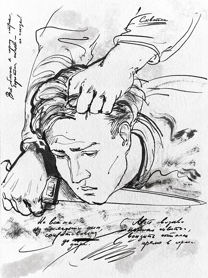 Но братадерзости, увы,сестра, конечно,не простила:почти не видяничего,за волосы егосхватила.Я из засады,напрямик,сцепился с нимза честь любимой:и очутилсяна полу,скрепя зубаминестерпимо.Он на менярычал, как зверь,и грузнонаседал на тело.Я бился с нимкак бультерьер —во мне от злостикровь кипела!Но он – сильнее,ловче, злей!Вдруг сильноухватил за горло —я задыхался,чуя смерть,сил не имеядля манёвра.Но всё же,из последних сил,сопротивлялсядо упора.Вот он уже схватилкинжал,вонзить пытаясьпрямо в горло…Всё ближек горлу остриё,бороться —силы на исходе!Пронзила мысль:«Я за неёумру здесь: в башне,на восходе…»