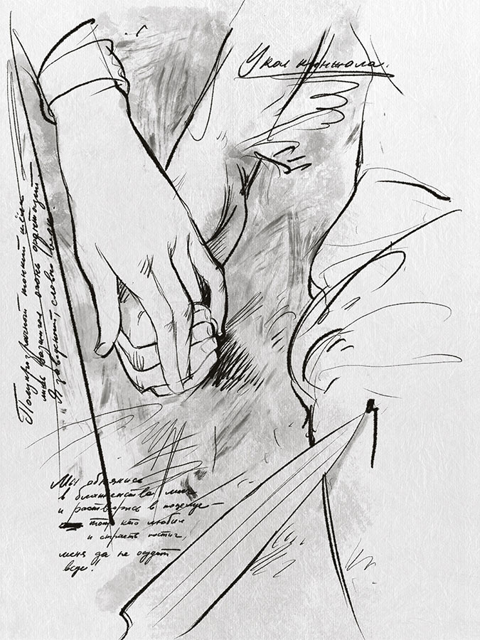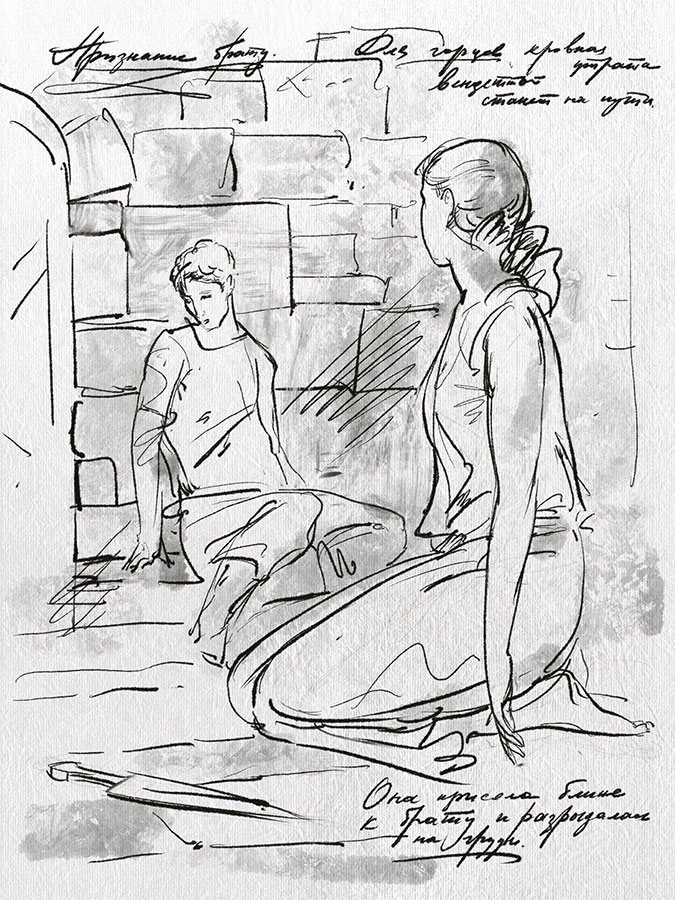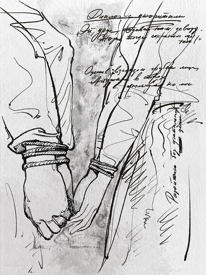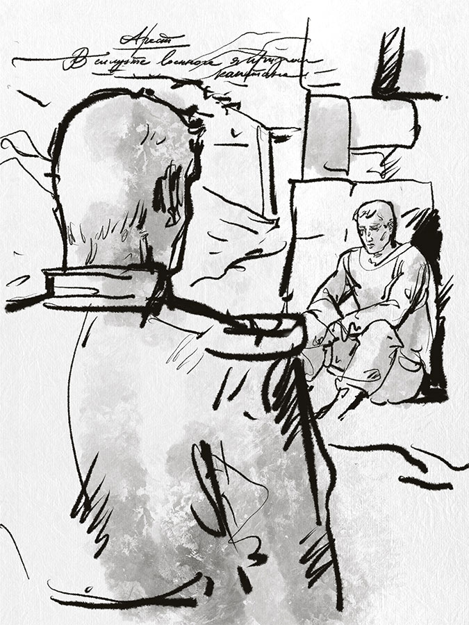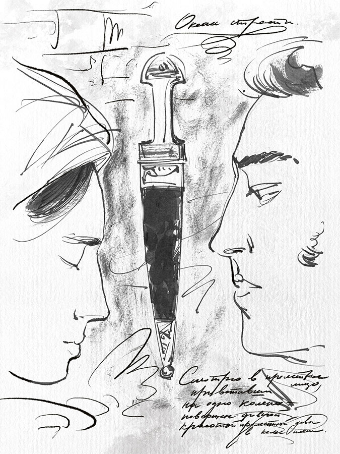 Дары доставшииз ларца,брат властноговорил с сестрою.Я ждалскорейшего конца:что же случитсяс дорогою?!Брат неожиданнопритих,упёрся взглядомв одну точку.Затем глазавзметнулись вверх —гримаса злостиодиночки!Отодвигаясьот него,она пыталасьчто-то спрятать.Брат грубооттолкнул её,схватив кинжал мой.Боже правый!Брат тряс кинжаломпред лицом,клинка деталиизучая —мне показалсяподлецом,с сестрой так грубообращаясь.Себя он крикомраспалял,а ярость нарасталав гневе.Брат по лицуеё хлестали трясся, будтобес во чреве.Тут брат воткнулкинжал в настил,схватил еёза край рубашки.Затем рванулчто было сил,грудь обнажиласьу бедняжки…
