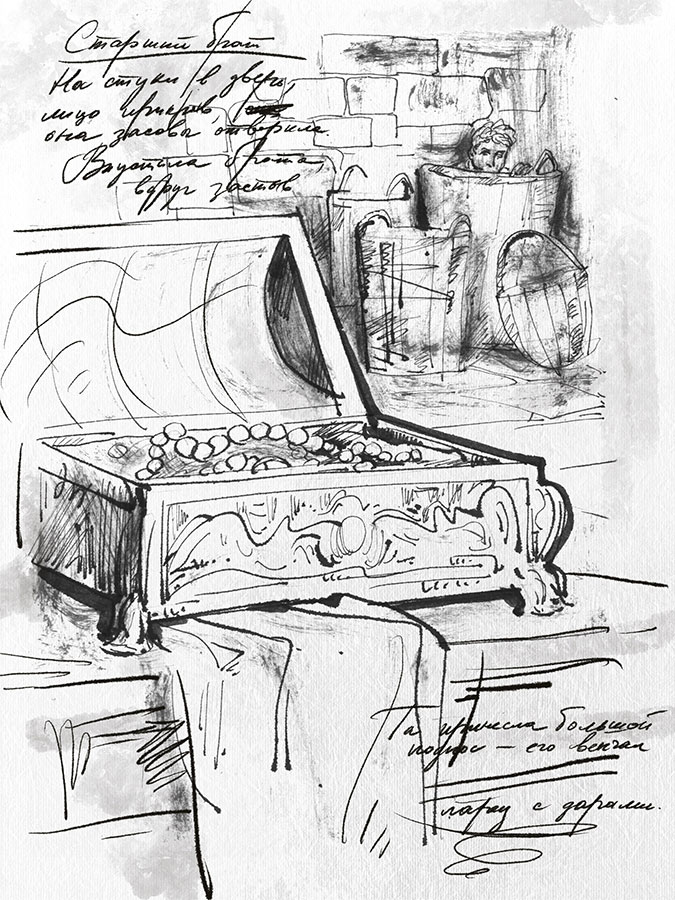 На стуки в дверь,лицо прикрыв,она засовыотворила.Впустила брата,вдруг застыв —за ним служанказаходила.Та принеслабольшой поднос —его венчалларец с дарами.Брат тихо задалсвой вопрос…Служанка скрыласьза дверями.Я из укрытияследилза назреваниемсобытий,То стал терпения предел,что тоньшепаутинных нитей!Брат ближеподошёл к сестре,шепча на местномдиалекте —отдельныеслова я знал,но суть не понялв том контексте.Пред нею братраскрыл ларец,стал соблазнятьдарами злата.Досталискусный образец —из шёлка платье,для богатых!Браслеты, кольца,гребешки —для достиженьянужной цели.И брат был вкрадчивпо-мужски:а речь, как будтоптичьи трели!..