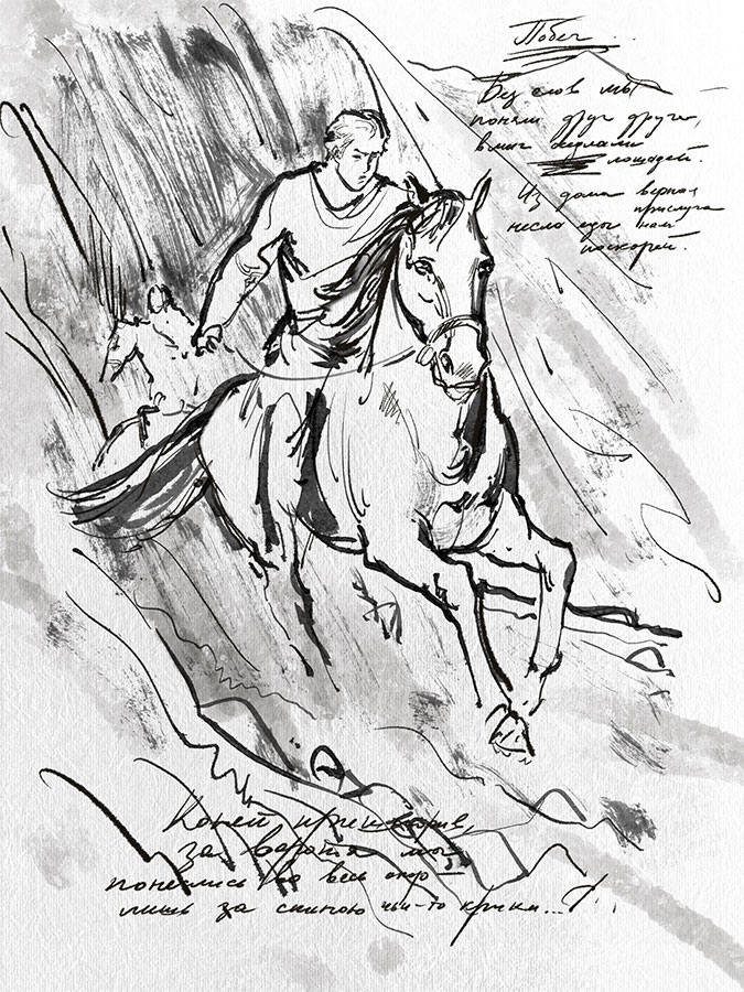 В ответ нам братмахнул устало —так попрощались.В дверь – бегом!Она на лестницевернуласько мнес сияющим лицом…Глядя в глазаеё большие,необычайнойглубины,вдруг осознал:«Мы друг для другатеперь на векисуждены!..»Здесь, в полумракестарой башни,её прелестныечертымне ощущались,как брильянтыв оправедивной красоты.Мне показалось,снова хочетздесь что-то важноесказать —и лишь потомона решитсясо мноювместе убежать.«Ответь, тыникогда не бросишь?И любишь лименя, как я!?»«Люблю тебя —безумно, очень!Ты для меня —судьба моя!»Мы обняли́сь,поцеловались —и побежаливниз, смеясь.Возле дверейостановились,глядя сквозь щели,затаясь…Но на дворевсё было тихо —фырчал на привязигнедой,с ним кобылицаворонаямотала мерноголовой.Без слов мыпоняли друг друга,вмиг оседлалилошадей.Из домаверная прислуганесла еду нампоскорей.Коней пришпорив,за воротамы понеслисьво весь опор —лишь за спиноючьи-то крикида злобныхвосклицаний хор.