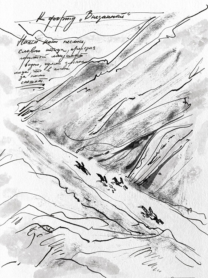 Наши кони неслисьсловно птицы,прорезаягористый ландшафт.И всё чудилисьзлобные лица —те, что следомв погоне спешат.Вот и горы —тут лошади встали…Здесь раскинулсясказочный вид:слева – речкав туманной вуали,да орёлв синем небе парит.А внизу – толькосерая башняда погоня:вот-вот будет тут!Надо ехатьтропою бесстрашно:у реки,в гарнизоне – приют.На скалистомобрыве Акташавозвышаетсякаменный форт,неприступная крепость.Вся – наша!И любой тамбеду переждёт!Форт «Внезапный»построен с душою:церковь, и́збы,и каменный вал.Да казармы…Орудия – к бою,чтобы врагпобедить не мечтал.Рядом выстроенхутор казачий,где войска вернослужбу несут.Нам сюда – доскакатьза удачей!От погони друзьяупасут.