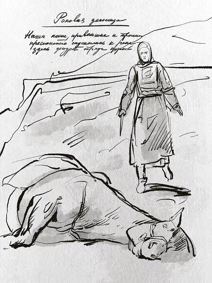 Наши кони,привыкшие к тропам,преспокойноспускались к реке —казаков здесьдежурят отрядыцокот копыт,скот домашнийпасут налегке.Но места у рекинеспокойны,раз абрекиворуют наш скот.И поэтомурусские воиныберегут от набеговтут форт.Мой гнедойоступился на камне,и копыто застрялов скале.Резко вздыбилсяи повалился:хруст ноги —и гнедой на земле!Я успел спрыгнуть,прямо на камни…Что же делатьс калекой гнедым?Пристрелить нечем,бросить – коварно!Я расстроенэксцессом таким.И тогдамолодая девицасоскочилас седла вороной:чтоб еёроковая десницакровь пустилаконю в час ночной.Кровь рванулафонтаном из веныумиравшегов муках коня.Хладнокровнокинжал вытирая,наблюдалаза смертью она…