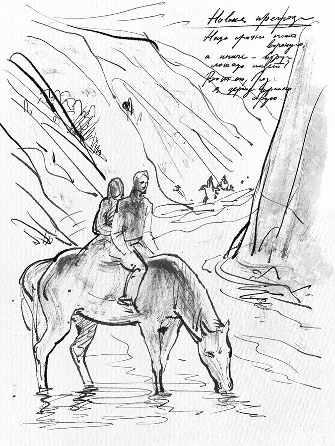 Я смотрел на неёнеотрывно,и она ощутиламой взгляд:«В путь пора!За гнедого обидно.Одна лошадь —печальный расклад»!Мы спускалисьтропинкой крутою,обогнулиприродную падь.Вон – Акташ,дотянуться б рукою…Дальше – форт,где им нас не достать!Приближаясьс реки к гарнизону —к башням, к валу,к подножью горы —мы с лихвойизвели кобылицу,вот и спешилисьтам, до поры.Напоить бы скорейвороную,а не товедь и вправду падёт.Вот и брод:я держу крепко сбрую,хоть река здесьи тише течёт…* * *Обхватив своё счастьеза талию,снова в жаркийслились поцелуй.Моментальномы впали в феерию —нет погони,уже не рискуй!Воронаяпила воду жадно,омываякопыта в реке,вдруг заржала:знать, что-то неладно.То собратья —и невдалеке!Не успев оседлатькобылицуи отправитьсявброд по реке —трое всадников(грозные лица!)нас настигли…Винтовки в руке!