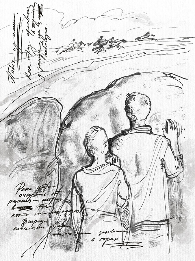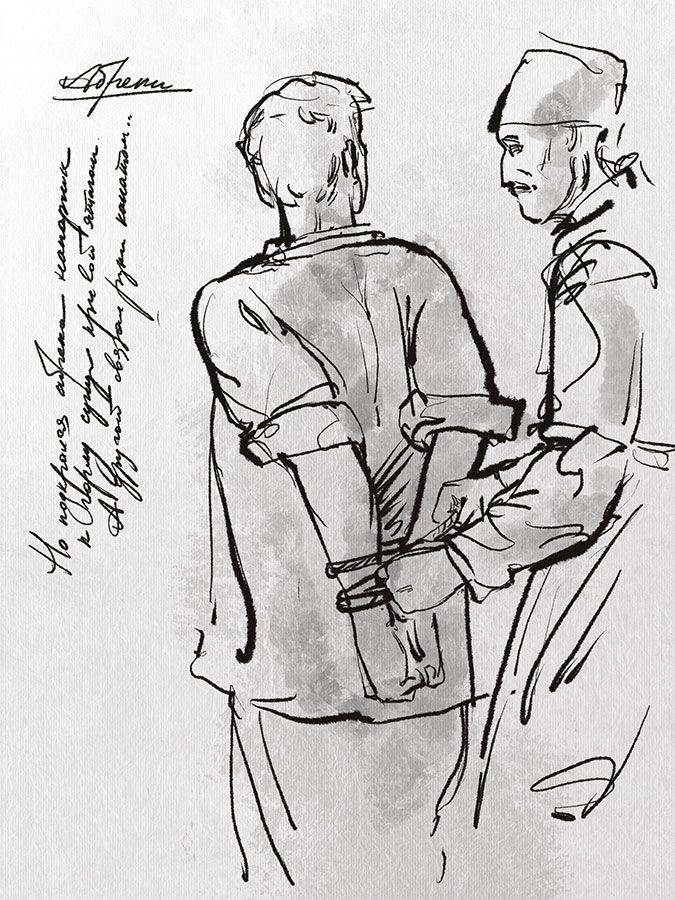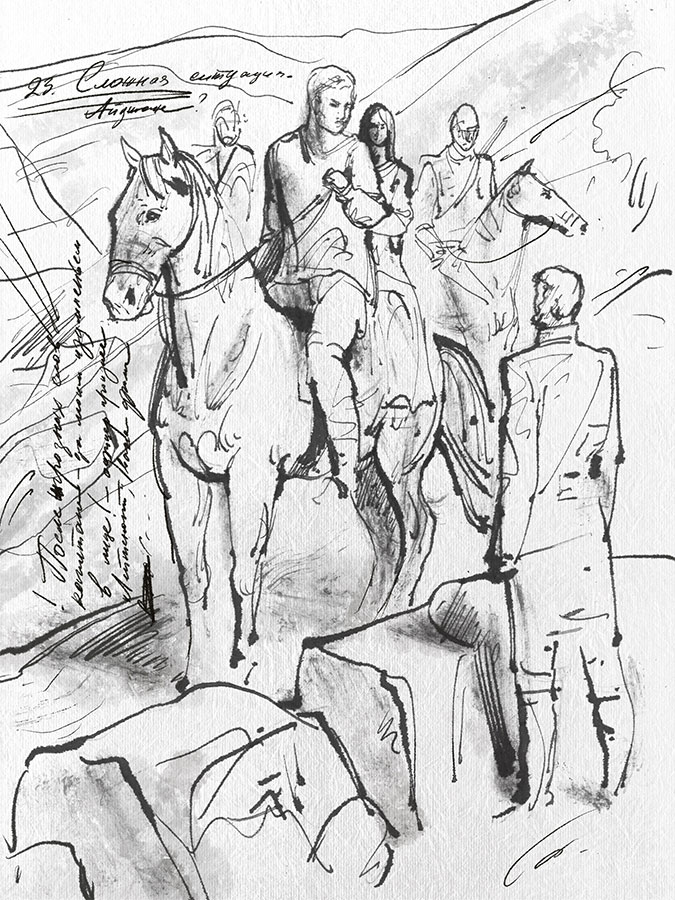 В силуэте военногоя признал капитана:он в белёсом туманестоял у скалы.Направляя бинокль,тот увидел картину:как среди валуновтихо прятались мы.Я привстал из засады,подавая сигналы —он заметил их вдруг,конь его поскакал:«Дорогая, вдали —это наши уланы!Мы в надёжных руках.Повезло, так и знал!»Осадивши коня,капитан лихо спрыгнул,обняли́сь мы радушнопосле всей кутерьмы.«Очень рад, Александр! —он радостно вскрикнул. —Не волнуйся, дружище:теперь – спасены!»А потом из ружьядважды выстрелил в небо,и на этот сигналвсе вокруг собрались.Братья вместе с сестройговорили о чём-то.Непонятно – простили?!Но потом обнялись…Остальные уланытут спе́шились рядом —отобрали кинжал мой,ружьё, ятаган.«Лейтенант арестован:украл малолетку!» —хоть с улыбкой, но строгозаявил капитан.