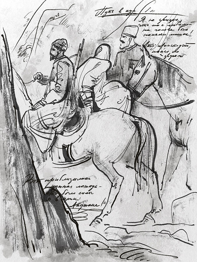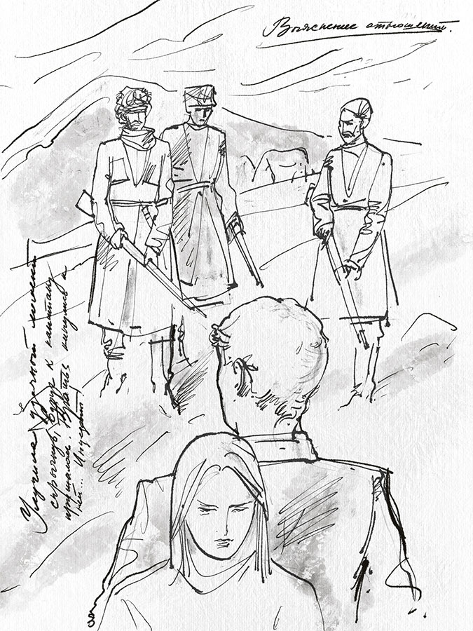 Асламбек покивалкапитануи в ответречь свою произнёс:«Уважаю сутьвашего плана.И уверен —всё будет всерьёз!Вы, согласногорским обычаям,засылайтенам сватов в аул.А на свадьбесвершим ритуалы!Мой кинжалпередаст караул…А сейчас Айджанеедет с нами,за неё – я вамслово даю!Мы достойновас встретим дарами,друг вольётсяв большую семью!».Айджане селак среднему брату,кони медленнодвинулись вдаль.Я с уланамии капитаном,отбыл в форт,заглушая печаль.* * *Прерывался наш путьочень часто,так как пленныееле тащились.Ощущение —будто абрекио побеге своёмсговорились.Так спускались мымедленно к крепости,еле тащит конь:два ездока!Путь нелёгокпо горнойокрестности:нам абреки обуза пока.