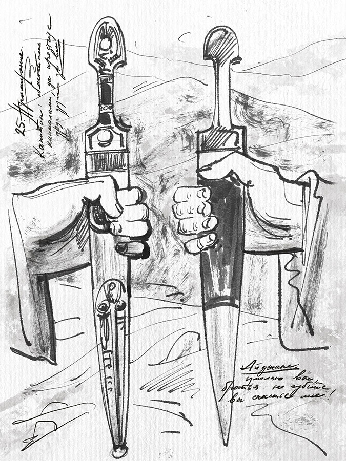 «И ещё признаю́сь —не со зла яв спину братавонзила кинжал.И конечно жеэто не тайна —Александрменя защищал!Я прекрасно владеюкинжалом:если б дажехотела убить,то пронзила ббезжалостно сердце…Раз брат жив —меня не́ в чем винить!»Капитан:«Обменяйтесьсвоими кинжалами,да проститедруг друга за всё!»Айджане:«Умоляю вас,добрые братья:не губите высчастье моё!Капитан, будьтесвадебным гостем —с вашей помощьюмы спасены!Братья, выне перечьте со злости,счастье с милымне знает цены!..»* * *Солнца ликпоявился в зените,тени стали корочев горах.Растворилисьтуманы в долине,стерх парилв голубых небесах.В это времякинжал её брата,в руки мнепередал капитан.Мой кинжал,жестом мирного акта,Асламбекуон следом подал…