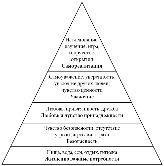 В случае с человеком под развитием потенциала подразумевается нечто, в большей мере связанное с эволюцией, чем у растений или животных, хотя принцип остается неизменным. Поскольку мозг вашего ребенка устроен очень сложно (что и позволяет ему чувствовать, думать, развивать социальные отношения и достигать целей), по своей природе ребенок нуждается в большем – в отличие от тех же птиц. Благодаря мозгу человек естественным образом чувствует себя спокойно среди других людей, может обрести счастье и найти смысл жизни. Мы, психологи, называем это явление способностью к самореализации. Известно, что к самореализации стремятся (при отсутствии отклонений) все люди. Стивен Пинкер[4] – нейробиолог, глубоко изучавший эволюцию мозга, – считает, что борьба за жизнь, стремление к свободе и к собственному счастью заложены в нас на генетическом уровне. По словам А. Маслоу, под реализацией потенциала нужно подразумевать ощущение комфорта, гармонии и полного удовлетворения – как в присутствии других людей, так и наедине с собой. Маслоу проиллюстрировал эту тенденцию с помощью пирамиды базовых потребностей (см. схему ниже). Вы наверняка знакомы с ней, но я хотел бы использовать пирамиду в несколько ином контексте, ориентируясь на потребности малышей.
