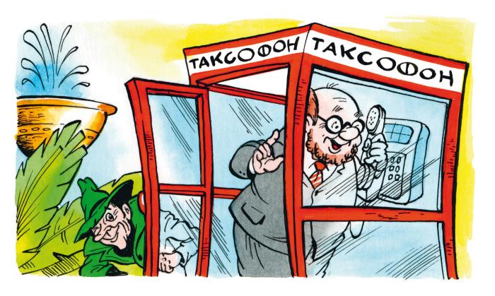 – Верно! – обрадовался шпион Дырка, достав маленький бинокль. – Глядите-ка, он с кем-то по телефону разговаривает. Давайте побежим вниз, на улицу, и подслушаем, с кем он разговаривает. Может, нам это пригодится.