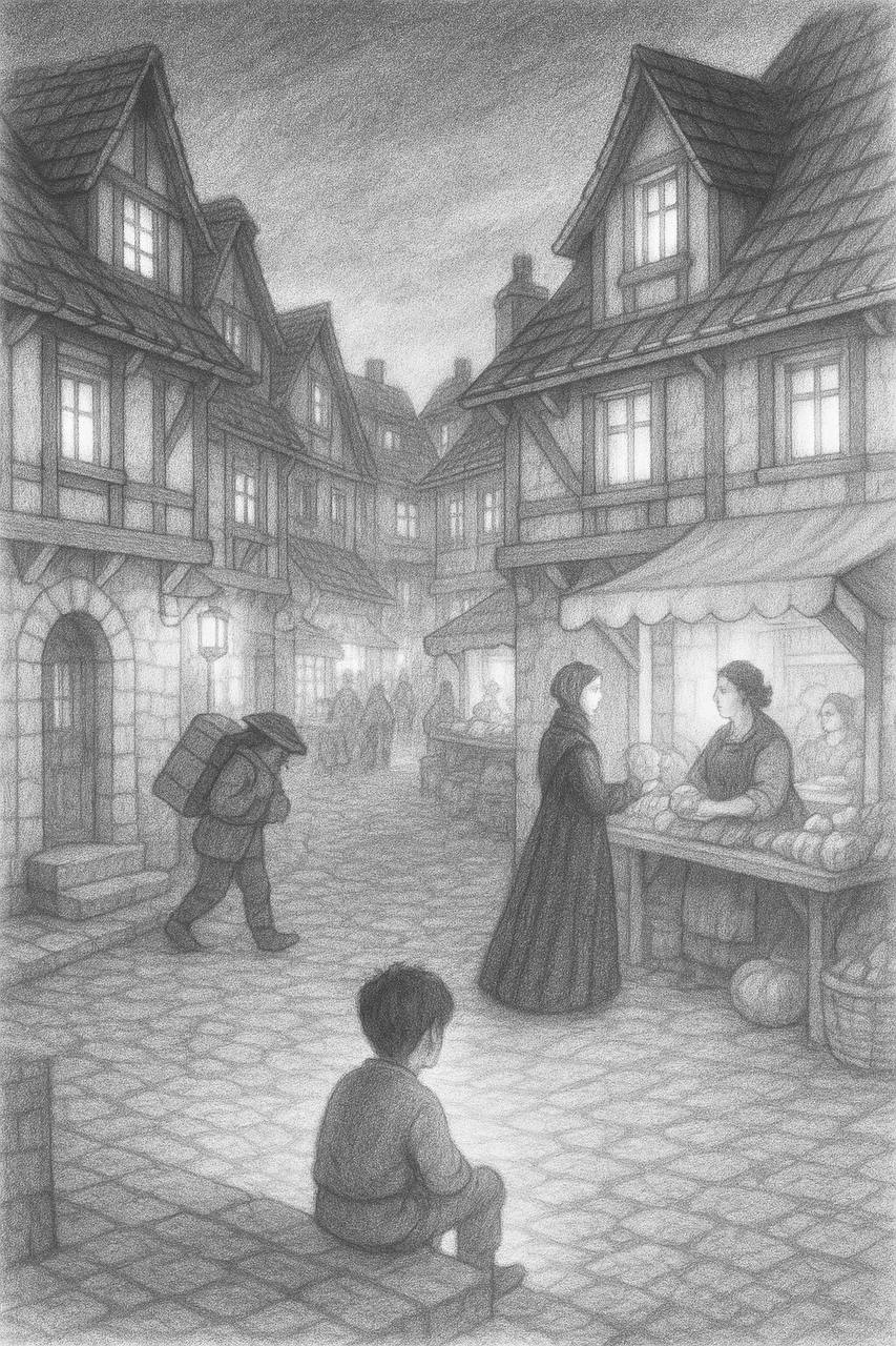 Со стороны площади звучала приятная мелодия, смешанная с гоготом и улюлюканьем детей. С востока доносился приятный аромат свежей выпечки и сладкого сидра, от чего живот Тэлиаса умоляюще заворчал. Мальчик положил ладонь в район желудка и, не стесняясь, широко зевнул.