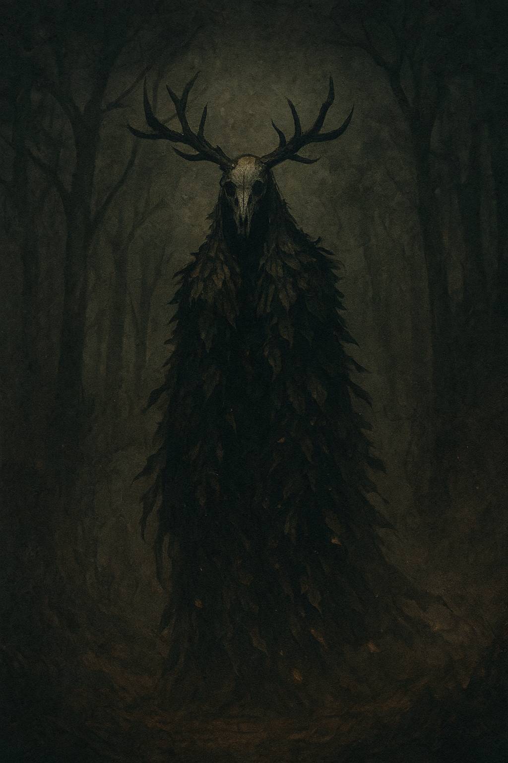 Тень стала ближе и четче. Теперь я могла разглядеть её: она была выше меня на три головы, тонкая, покачивающаяся как трава на ветру. У тени не было лица, вместо неё олений череп. Тускло-белый, пожелтевший, с пустыми глазницами. Рога – широкие, ветвистые, будто вырезанные из сухой древесины. На черепе мох. Листья. Впаянные в череп, как листва сливается со старыми могильными камнями. Плащ – или нечто вроде него – был сшит из засохших листьев. Они держались друг за друга, как рыбья чешуя. Они шуршали, но я не слышала звука. Только знала – они двигаются.